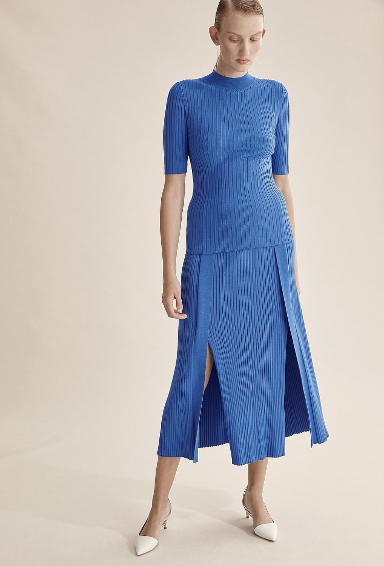 BLUE MIDI SKIRT WITH PLEATED DETAIL