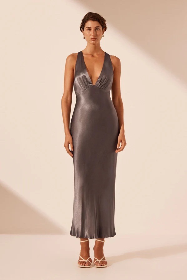 la lune plunged cross back midi dress - graphite