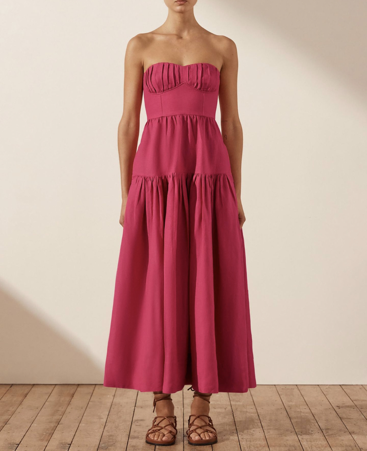 Joanine Strapless Ruched Midi Dress in Azalea Pink