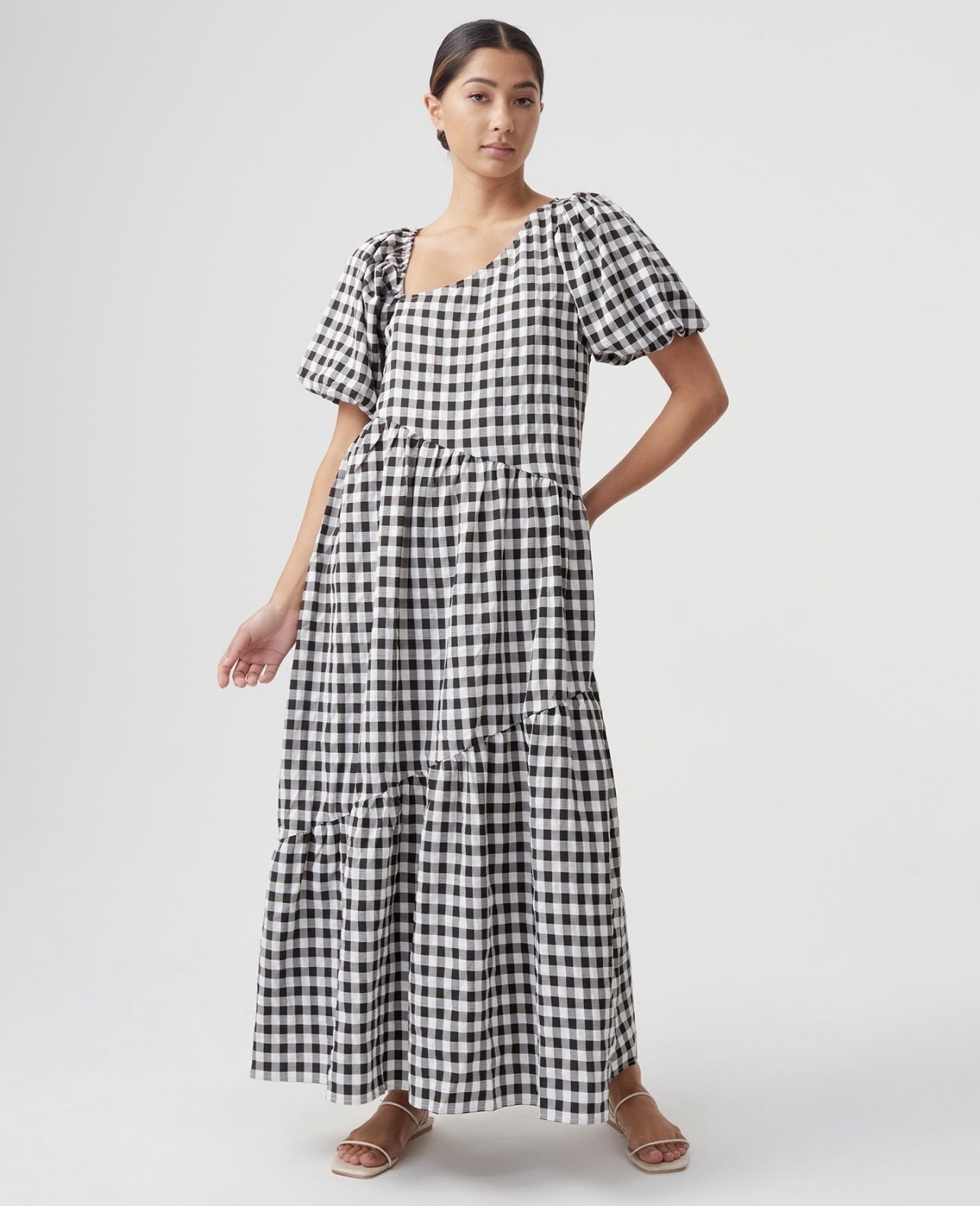 Gingham Asymmetric Maxi Dress –