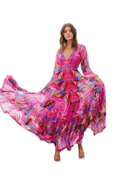PINK ROSE V NECK SHIRRED MAXI DRESS