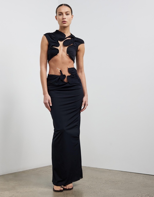 Christopher Esber Orbit Ruched Side Buckle Midi Skirt in Black