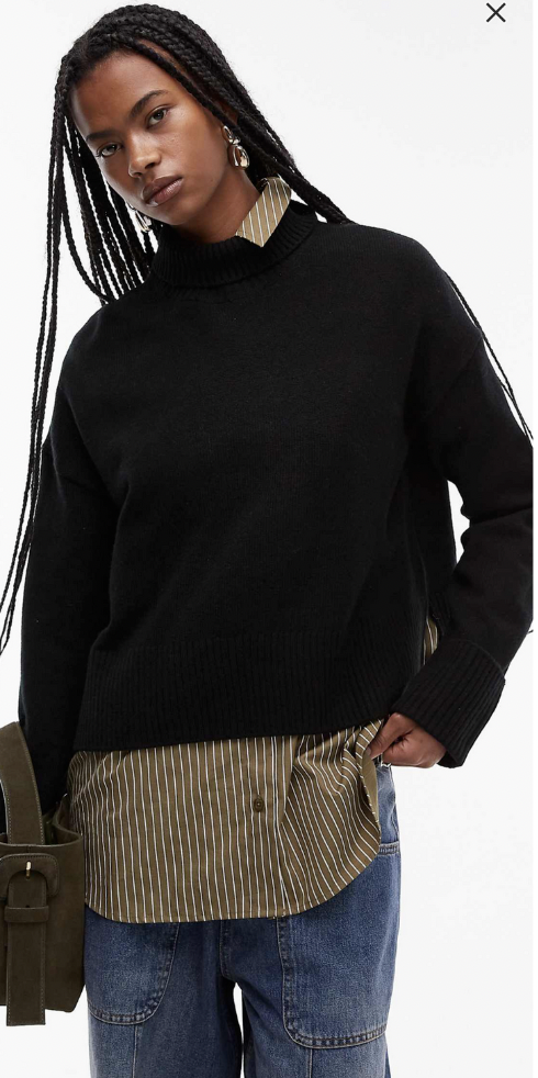 rib neck sweater with split back neck and turn up cuffs in black