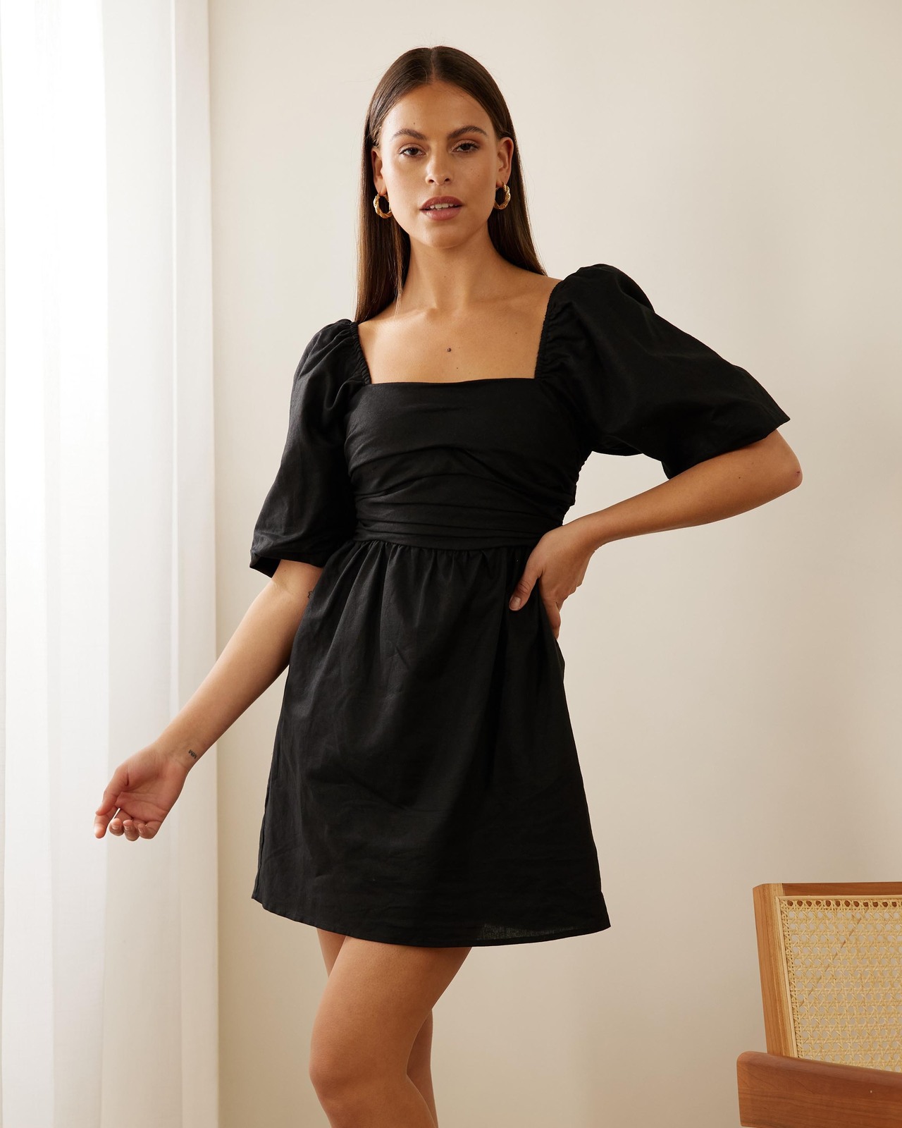 Fern Linen Blend Gathered Puff Sleeve Mini Dress