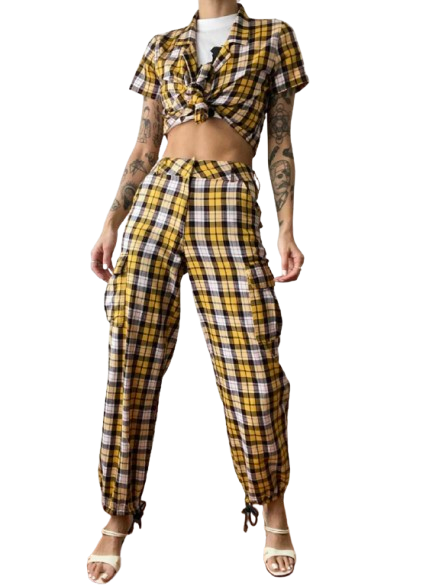 Keidis 90s Plaid Yellow Black Tie Front Crop Top XS