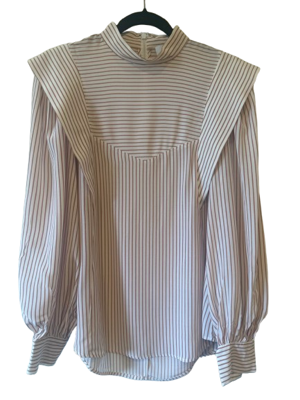 High neck gathered sleeve stripe shirt with a zipper back