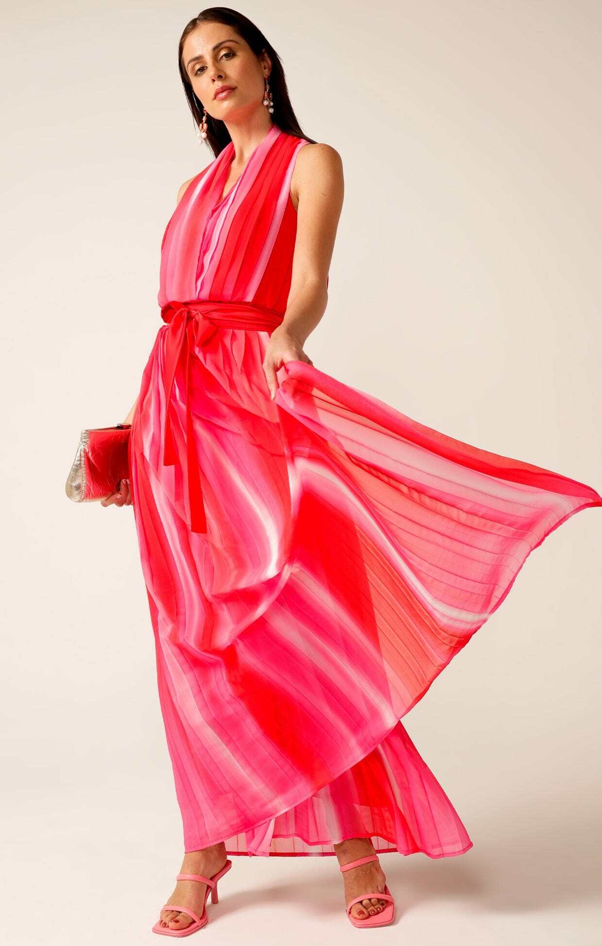 THRILLER PLOT PLEATED DRESS IN RED PINK OMBRE