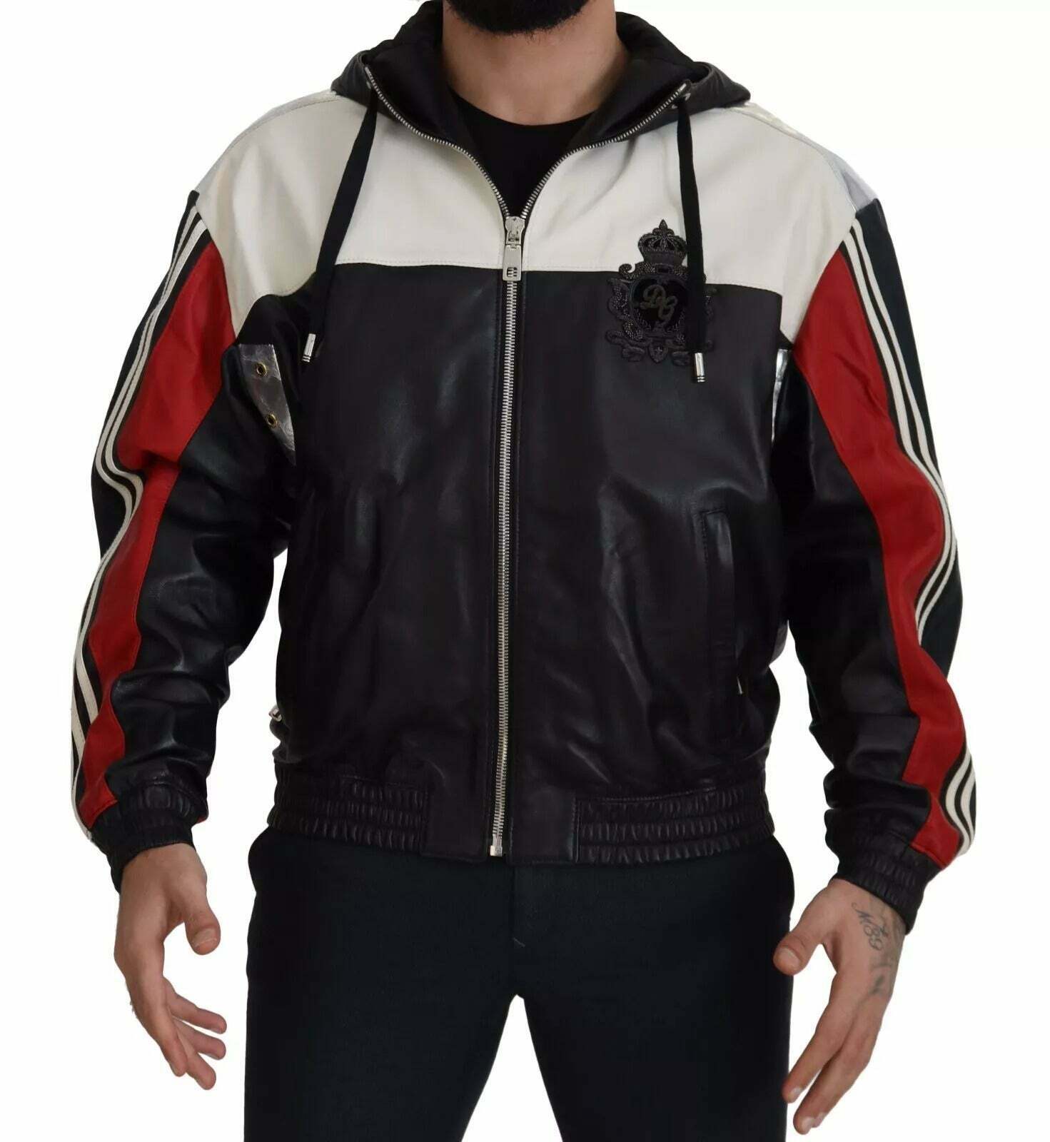 โข Black leather material โข Hooded design โข Blouson style โข Designed for men