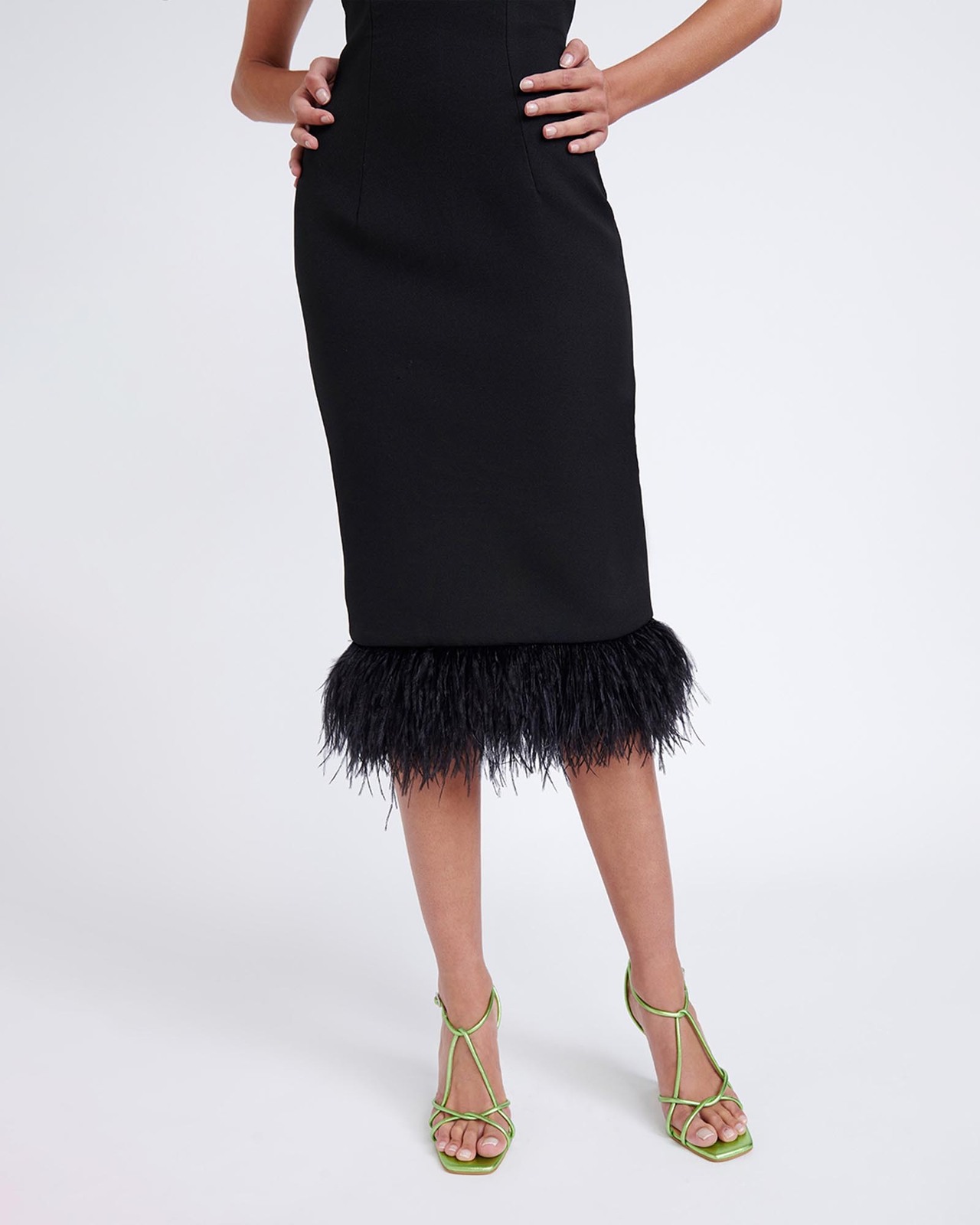 Accented with a feather hem, this **Lidi Feather Midi** from **BY JOHNNY.** adds a playful element to your evening ensemble. - Woven fabrication; some stretch - Strapless - Back zip closure - Back slit - Feather hem trimming - Midi length