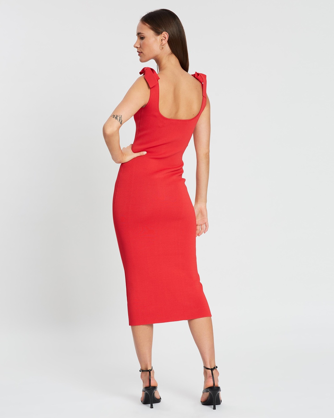 Clean lines and sculptural-yet-feminine flourishes define Australian designer label **BY JOHNNY.**'s innovative approach to womenswear. Crafted from a stretchy knit material in a bright candy red hue, the **Tie Up Knit Midi Dress** exudes sleek and modern appeal. Our model is wearing a size small dress. She is 170.2cm (5’7”) tall with a 80.0cm (31.5”) bust, a 61.0cm (24”) waist and 76.2cm (30”) hips. - Side Seam Length: 108cm (size small) - Slim fit - Stretchy knit fabrication; opaque - Candy red hue - Adjustable self-tie shoulder straps - Scoop neckline and back - Slip-on design - Unlined