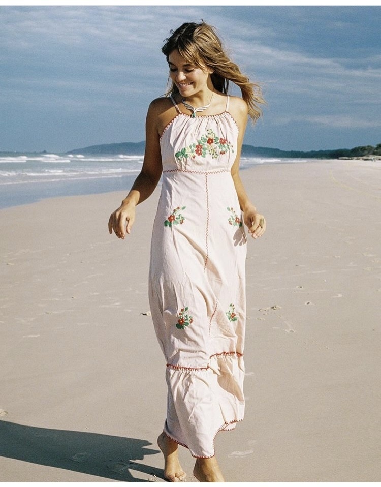 The perfect summer dress! Gorgeous pale rose softest cotton with exquisitely detailed hand embroidery throughout- little red flowers amazing, and ruffle detail hem divine. Super flattering cut and so so pretty .