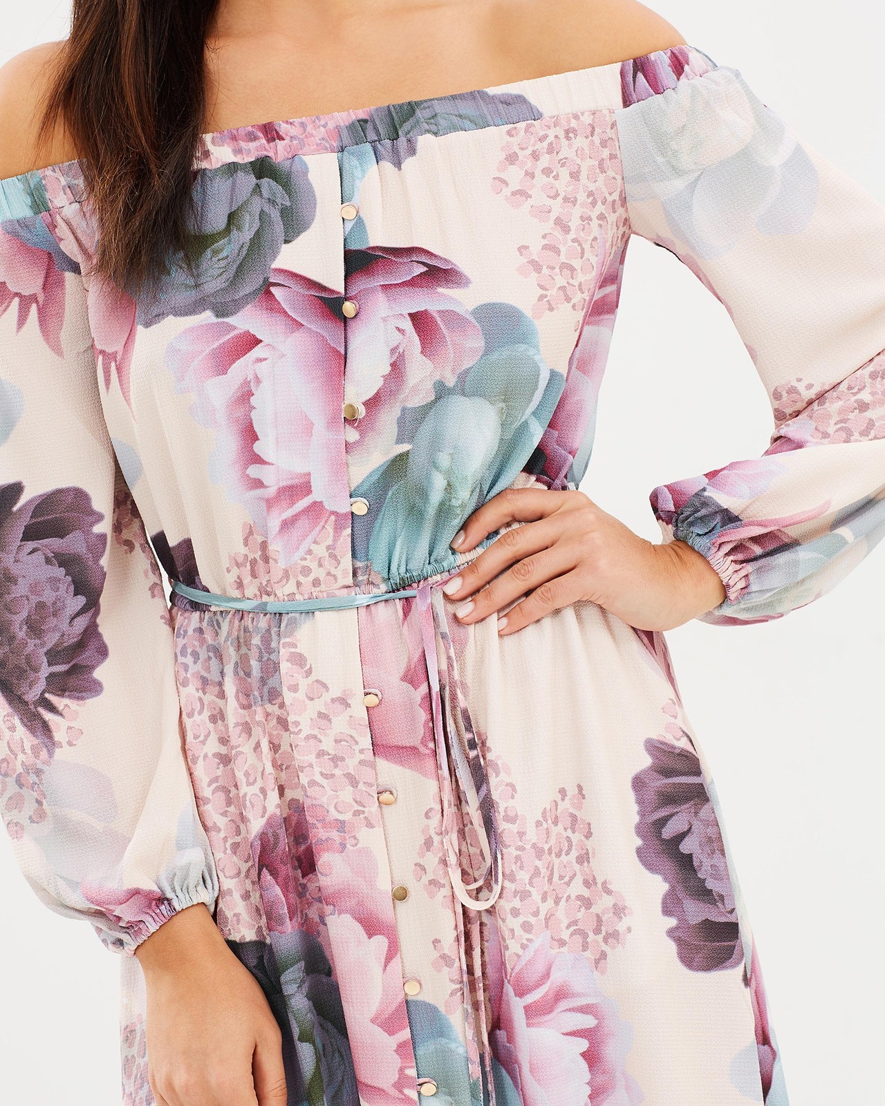 The **Pasduchas Bella Midi Dress** ticks all the right boxes for summer cocktail dressing. The dress has an off-shoulder neckline, allowing you to show off your bronzed skin, and has a romantic floral print in soft pastel shades. The dress is made from stretch crepe fabric for total comfort as you move. Our model is wearing a size AU 8 dress. She usually takes a standard AU 8/Small, is 5โ9โ (175cm) tall, has an 89cm bust, 94cm hips and a 69cm waist. - Length: 155cm approx. (size AU 8) - Relaxed fit; elasticised waist - Stretch crepe fabric - Musk pink shade; pink and blue-green floral print; pink leopard print - Elasticised neckline - Button-down front; gold-toned buttons - Long balloon sleeves; elasticised cuffs - Slender fabric waist tie - Hip pockets - Midi hemline - Unlined