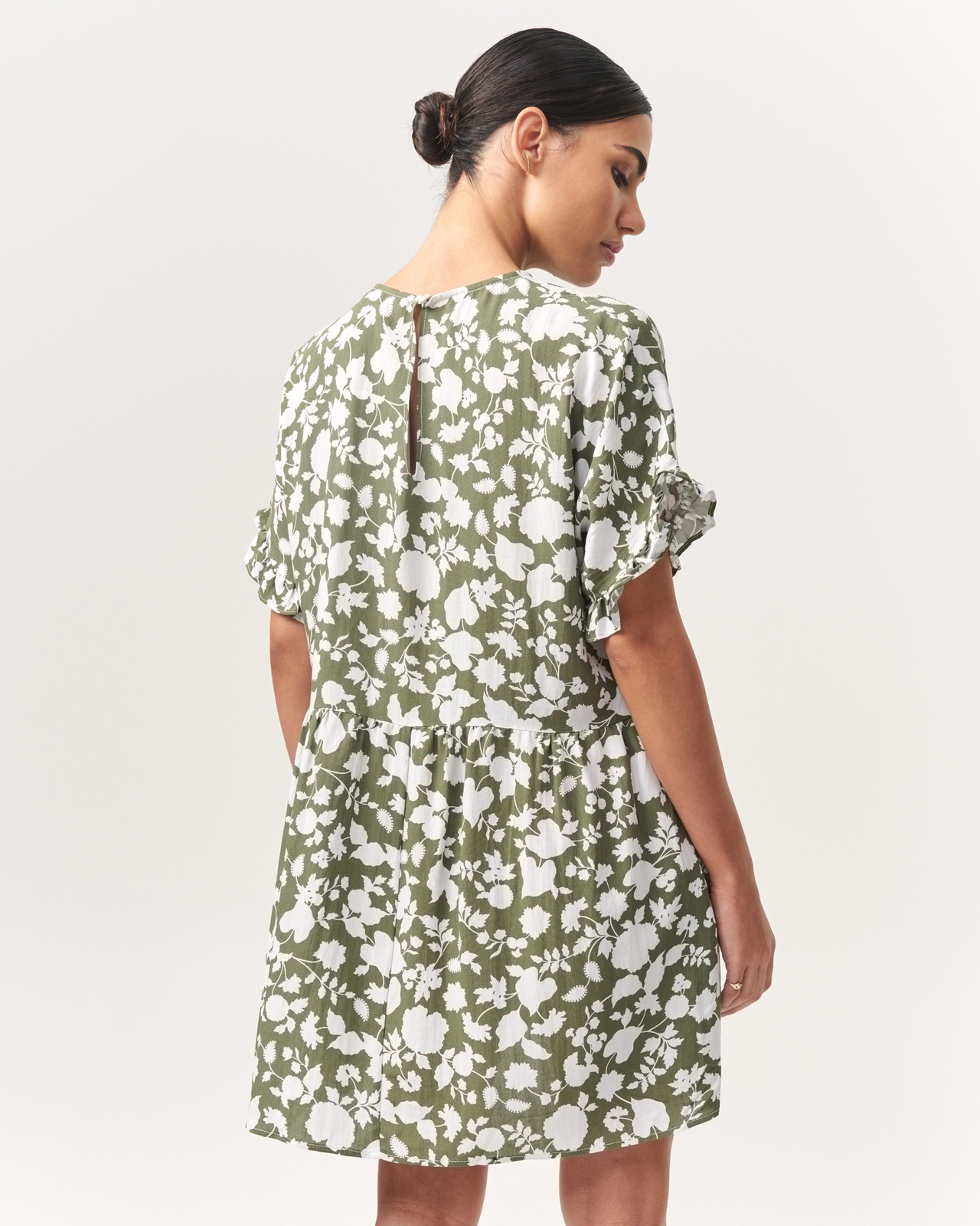 Designed in Australia, **The Fated** is made for the free-spirited who are drawn to the world by its ethereal beauty. Think playful prints designed in-house, feminine floral designs and earthy tones inspired by nature. Committed to the future of responsible fashion, we support our community with ethical supply chains and environmental initiatives. Our model is wearing a Size AU 8/S (US 4/S). She usually wears a standard size AU 8/S (US 4/S), is 175cm tall, has a 76cm bust, a 58 cm waist and 94 cm hips. - Length: 84cm Bust to Hem (Size 8 / S AU) - Woven mini-length dress - Relaxed fit - Short sleeves with ruffles - Keyhole opening; rouleau loop and button fastening - Designed in Australia Care Instructions: Cold gentle machine wash/ hand wash