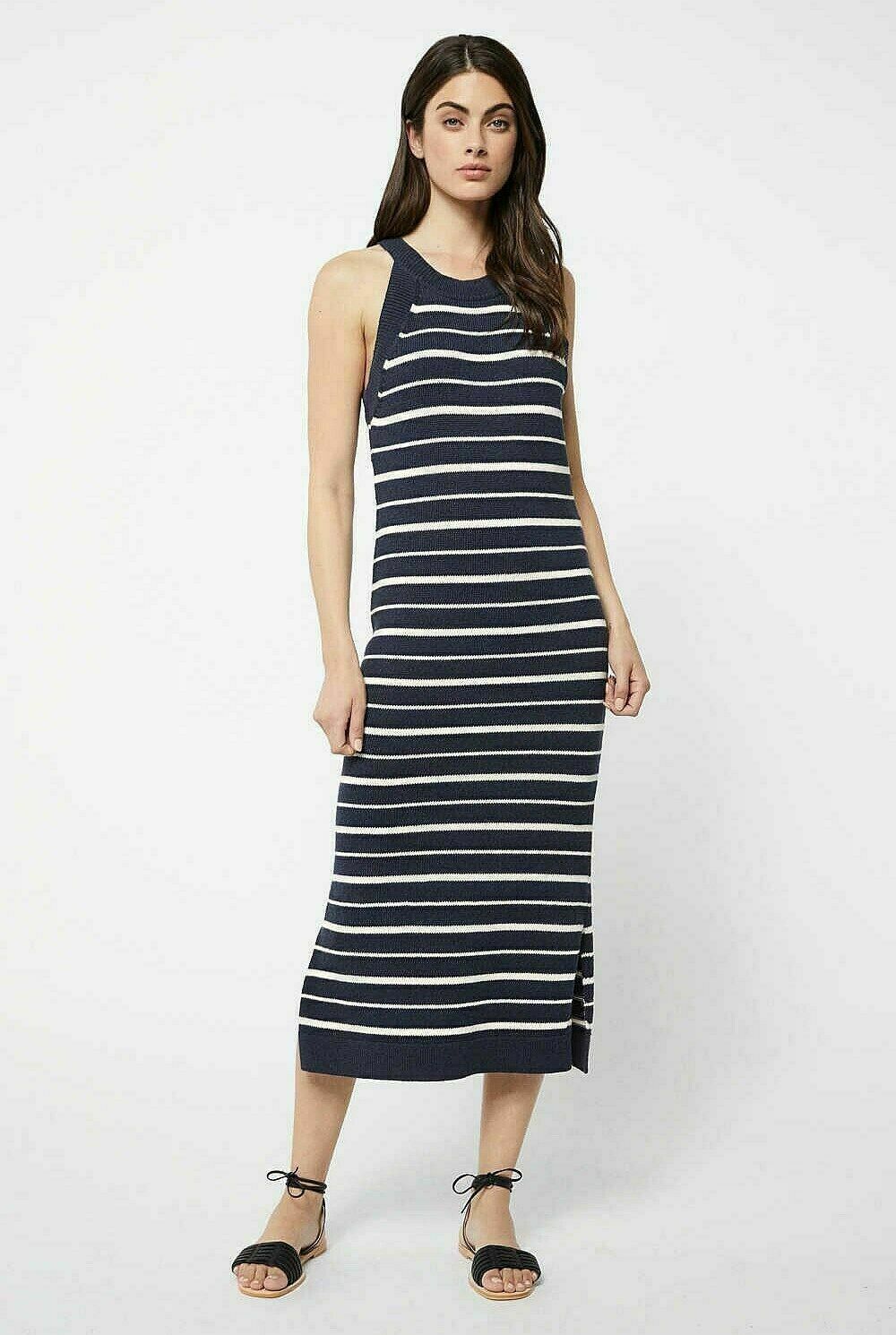 WITCHERY Navy Stripe Cotton blend Knit Sleeveless Midi Dress Elegant high halter neck design, featuring side splits at the hem and ribbed trim. Size Small.