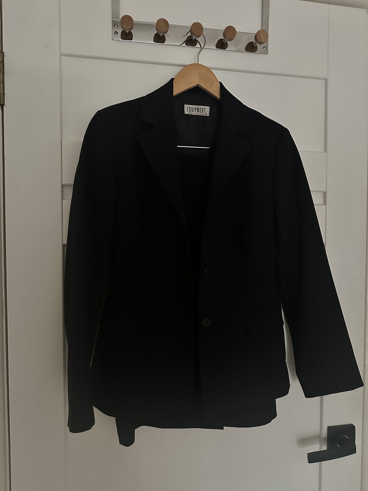 Navy blue blazer & skirt. Blazer fully lined, two pockets (never unstitched), three buttons. Slit in back of skirt. Made in Australia.
