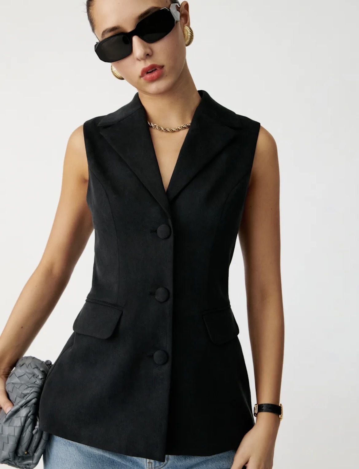 Reformation Billie Vest The Billie is a full-length vest with a collared neckline. It features a button front, pocket details, and a small back slit.